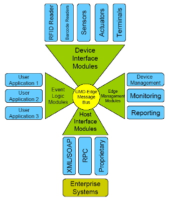 UMD- Edge is an Information and Communications Technology (ICT) platform that enables Enterprise Systems to relegate responsibility for control, management and monitoring of Edge Devices, such as RFID and barcode readers, actuators, sensors and human interface terminals. UMD- Edge is based on next generation message management software, which moves data capture functionality from Enterprise Systems to locally based network devices. The UMD- Edge modular construction makes it ideal for many data capture applications, such as:
